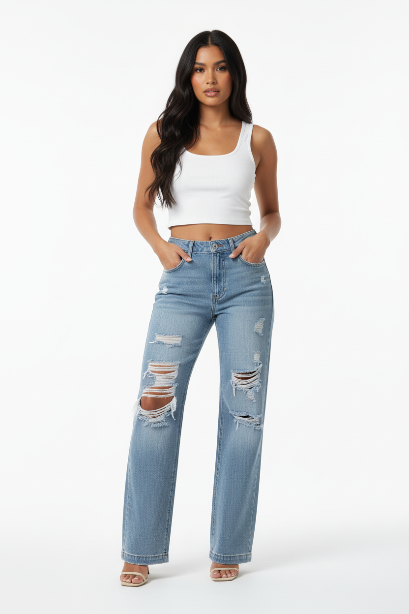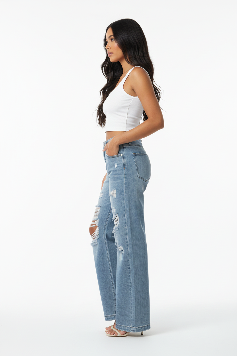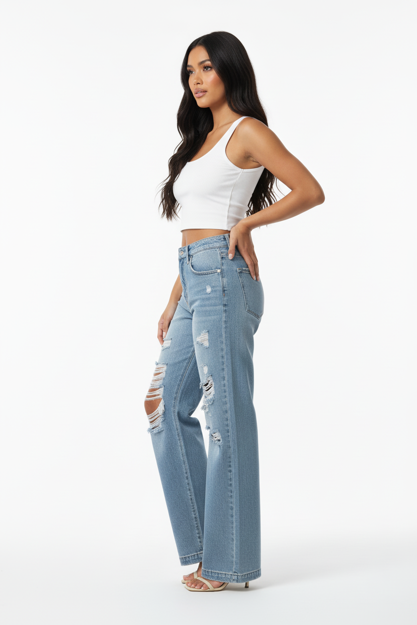 Distressed Wide-Leg Denim Jeans - Light Blue